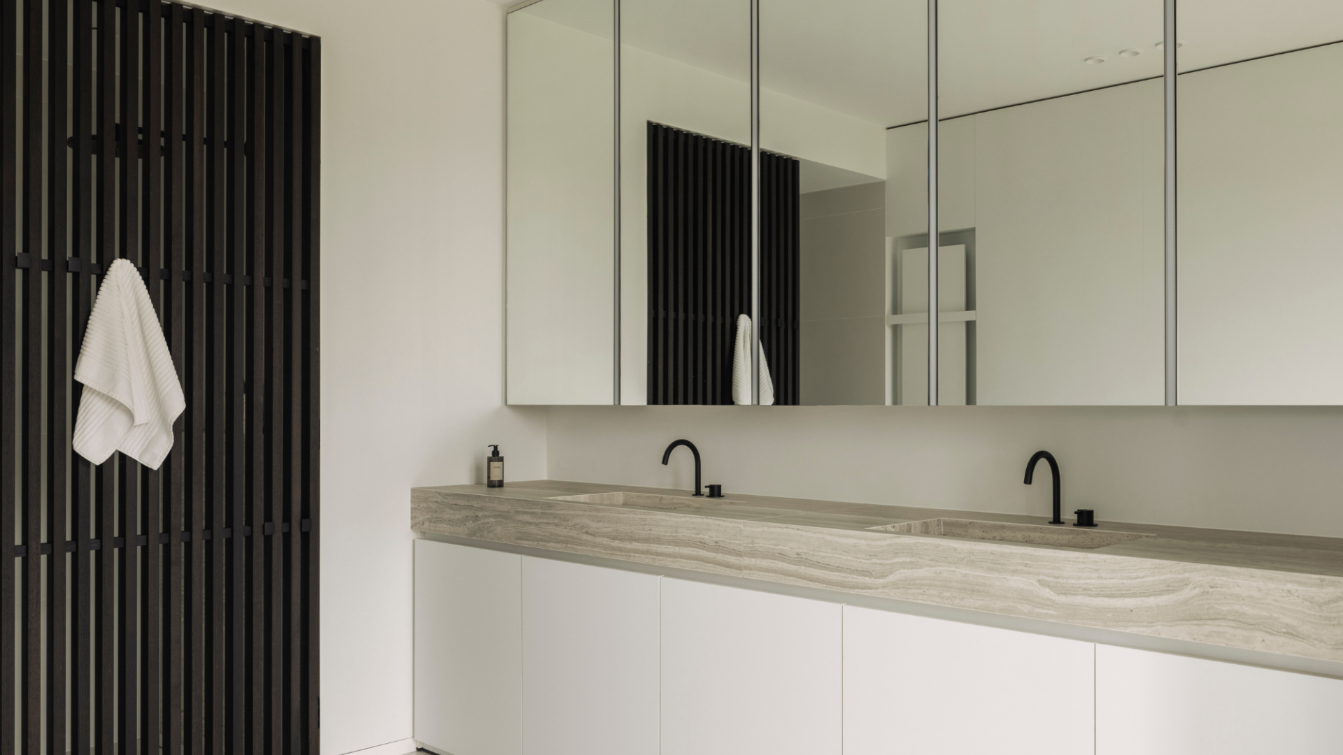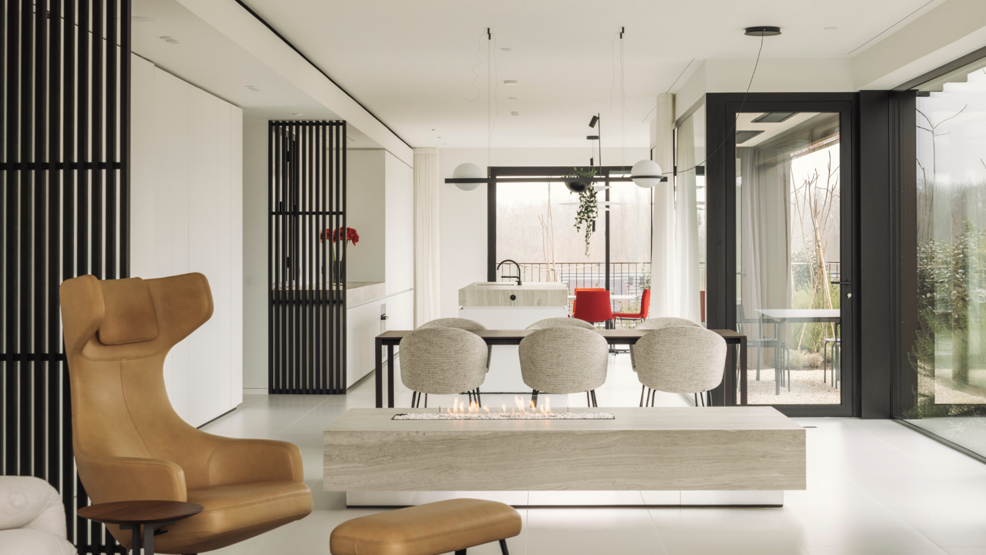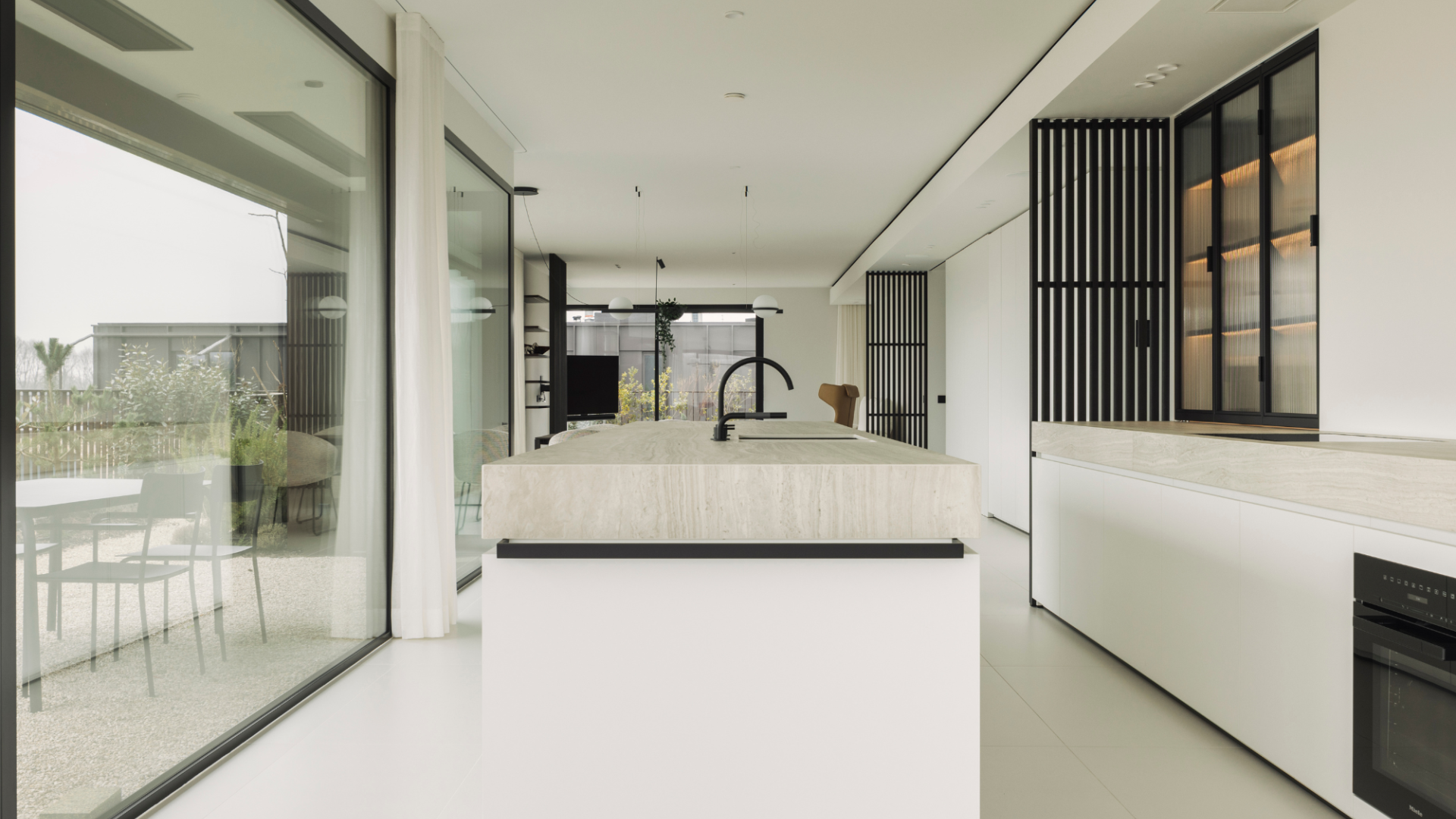 De keuken en leefruimtes zijn strak en functioneel ontworpen, met hoogwaardige materialen zoals Fenix Bianco Kos, Shinnoki Stardust Walnut en Astrata van Decospan. Door het gebruik van natuurlijke materialen ontstaat een harmonieus geheel dat rust en verfijning uitstraalt. De technische voorzieningen zijn discreet weggewerkt in een strak plafondontwerp, wat bijdraagt aan een minimalistische en serene uitstraling.