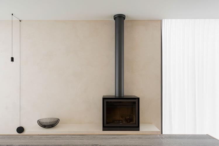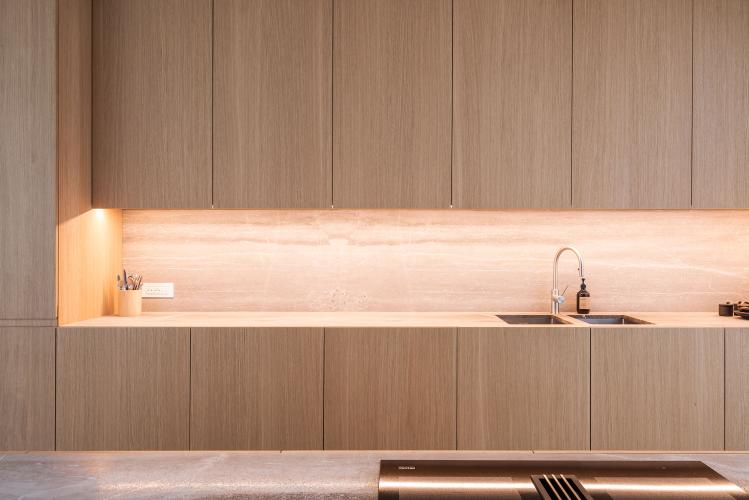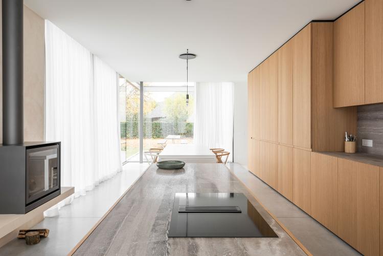 Sophie zoekt steeds naar eenvoud en eerlijkheid in haar ontwerpen. Daarom koos ze voor kastenwanden in eiken fineer. Ook het natuurstenen kookeiland werd met deze fineersoort afgewerkt. In dit minimalistisch ontwerp is alles netjes opgeborgen.