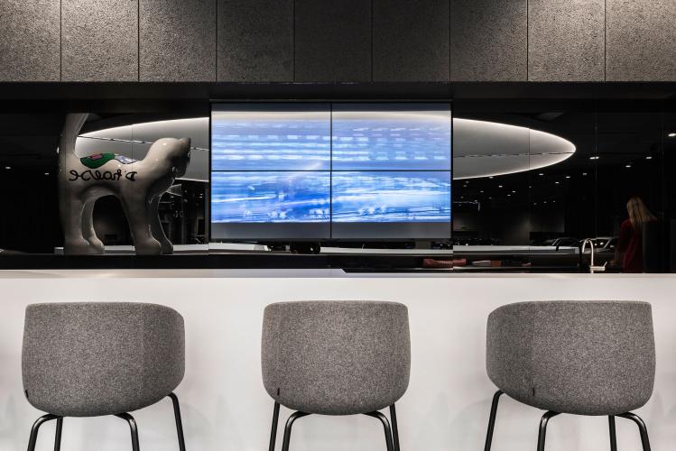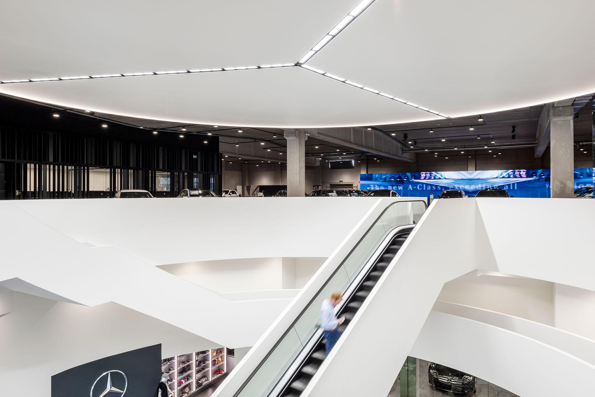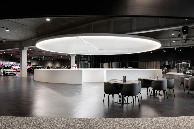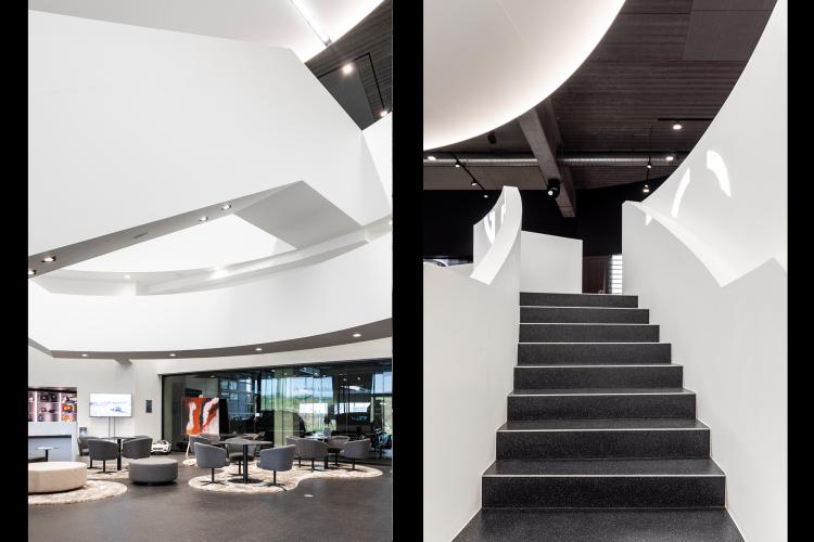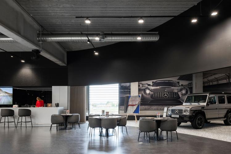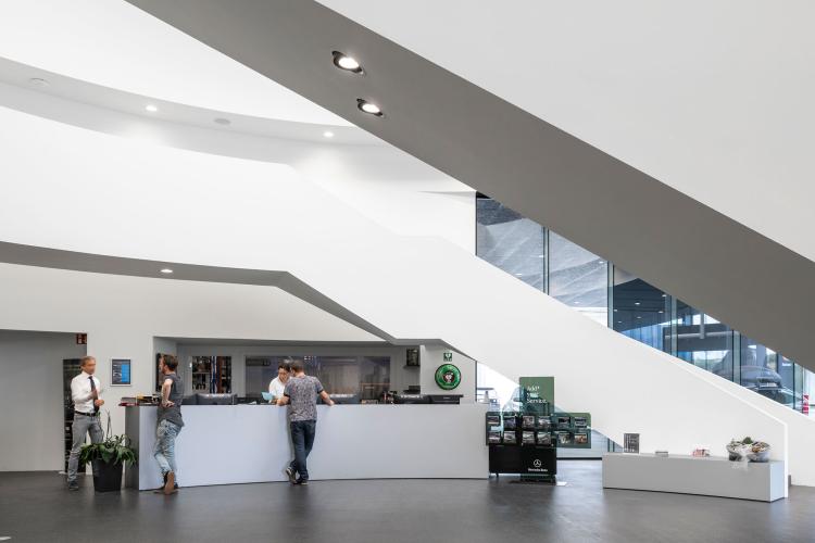 De AMG-sfeer werd door heel het center doorgetrokken. Veel beton, een centrale witte kern en veel diepzwart gelakte details. De glazen compartimenteringen die de kantoren en ontvangstruimtes scheiden van de toonzaal kregen een fijn zwart aluminium patroon. In het akoestische ronde spanplafond werd trouwens het logo van Mercedes geïntegreerd.