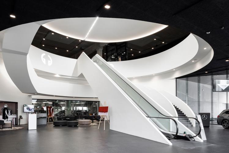 Het Mercedes experience center van de Ghistelinck Group te Kortrijk betreden, bezorgt iedere bezoeker een spontaan wauwgevoel. Goedefroo architecten ontwierpen de toonzaal en de kantoren rondom een majestueuze centrale cirkelvormige inkomhal. De imposante roltrap naar de toonzaal op de verdieping doorbreekt de cirkel.