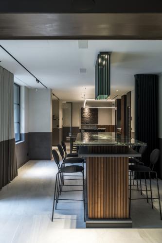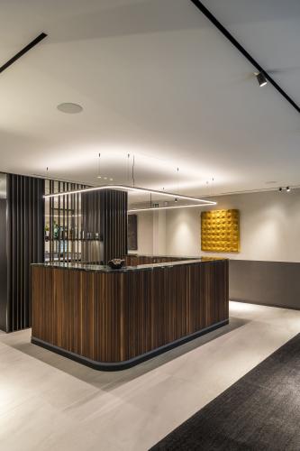 Het pronkstuk van de renovatie is de centrale bar, een eerbetoon aan de historie van het gebouw, maar met eigentijdse snufjes. Zelfs in de kleinste vergaderzaal tonen B Brand's ontwerpen finesse, met akoestische gordijnen die naadloos zijn geïntegreerd met absorberende elementen. De verlichting, een exclusief ontwerp van B Brand, schittert als accentverlichting in diverse ruimtes. Ook de bewegwijzering en het inkomlogo zijn meesterlijk ontworpen door het interieurteam.