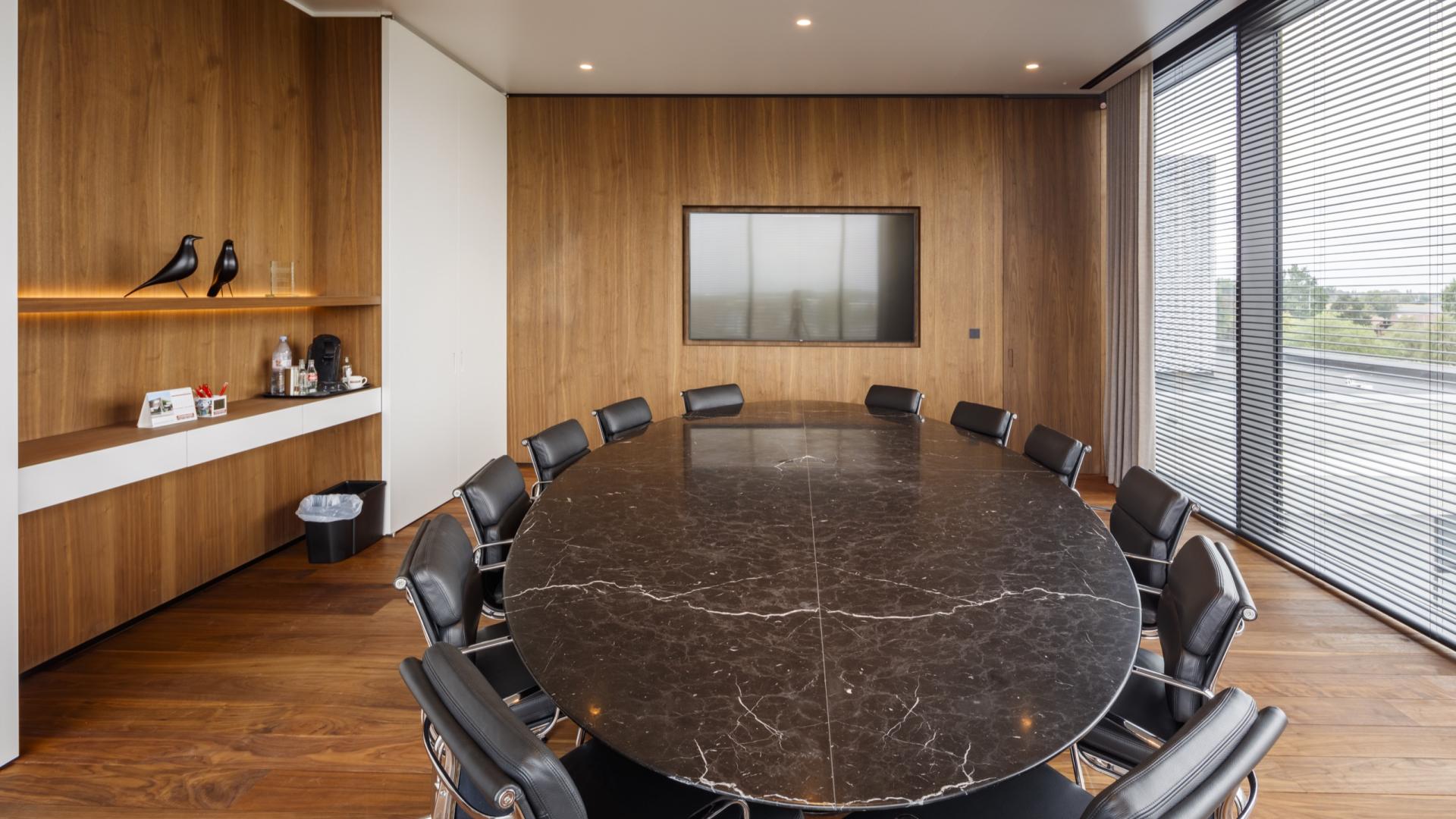 - Massief notelaar parket in combinatie met massieve natuurstenen vergadertafel