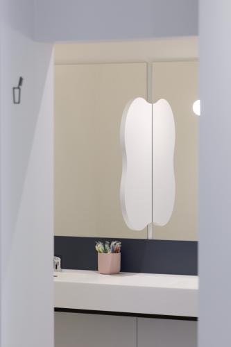 Samen met de architect kozen we materialen voor een warme, uitnodigende uitstraling. Geen steriele witte inrichting, maar zachte kleuren zoals grijsgroen, zachtroze en diepblauw. De mix van materialen: houttexturen, spuitplafonds en betegeling met matte en glanzende afwerkingen zorgt voor een rijk en tactiel interieur.